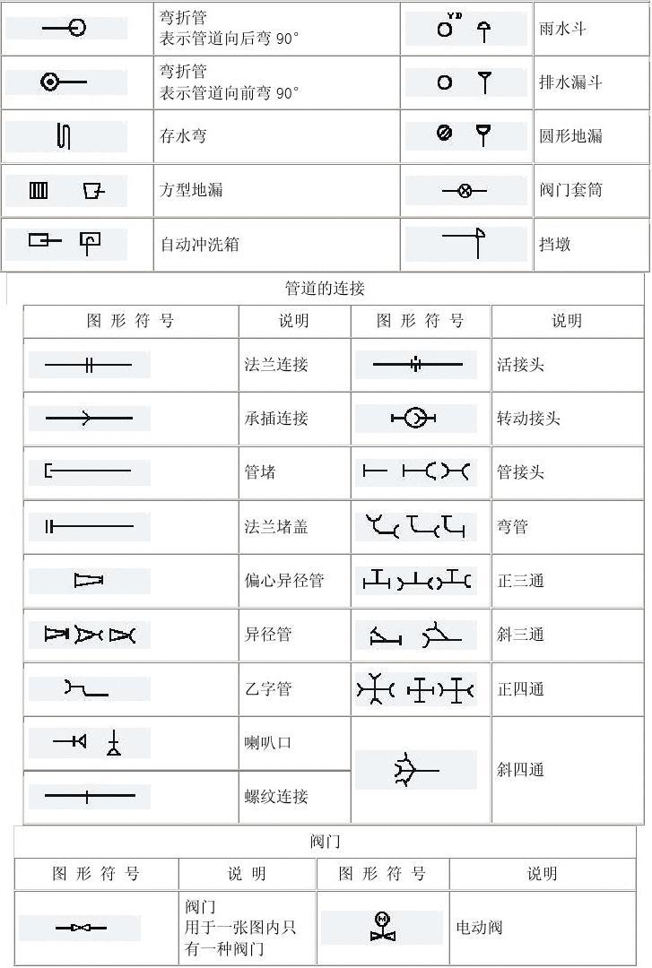 彎折管 表示管道向后彎 90° 彎折管 表示管道向前彎 90° 存水彎 方型地漏 自動(dòng)沖洗箱 管道的連接 圖 形 符 號(hào) 說明 法蘭連接 承插連接 管堵 法蘭堵蓋 偏心異徑管 異徑管 乙字管 喇叭口 圖 形 符 號(hào)